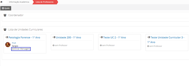 Se pretender enviar uma mensagem para o professor, utilize as opções de filtragem procurando pelo professor e caixa de dados dos professores e terá uma opção de envio de mensagem (conforme é ilustrado na segunda imagem em baixo).