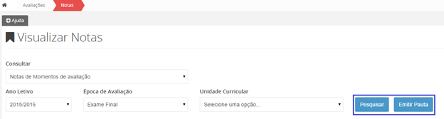 Caso pretenda obter as notas de avaliação de uma determinada unidade curricular em formato digital, clique no botão “Emitir Pauta” em que vai ser apresentado um documento em formato PDF para efetuar o download.