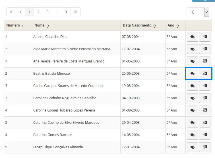 Visualizando novamente a lista de alunos, vai encontrar um botão para envio de mensagem (símbolo de mensagem) no fim da linha de cada lista.