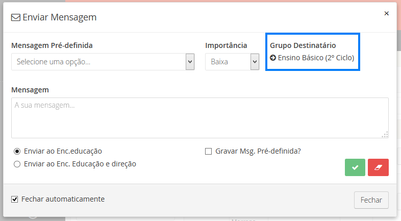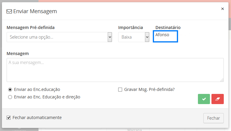 Tenha em atenção que ao clicar no botão de envio de mensagens, o encarregado de educação para o aluno em questão é selecionado automaticamente.