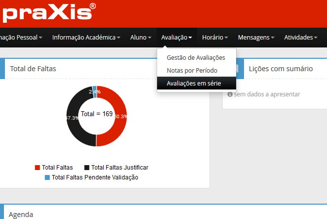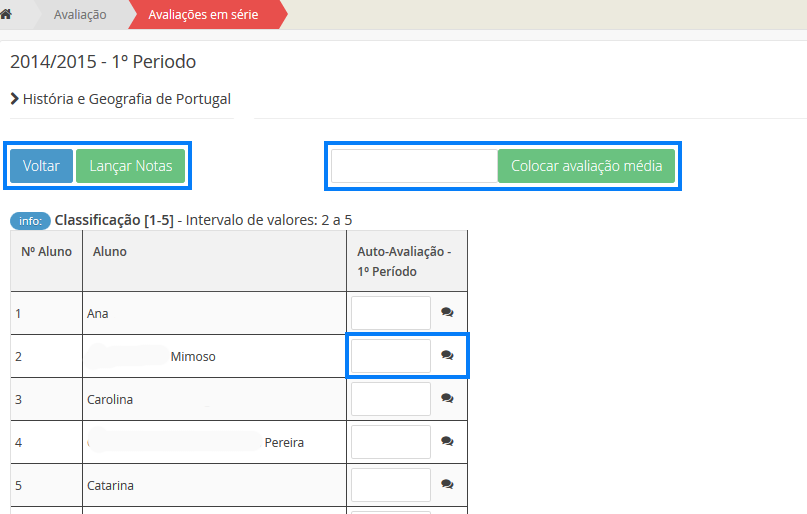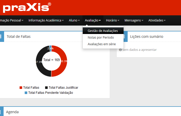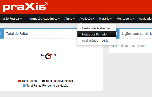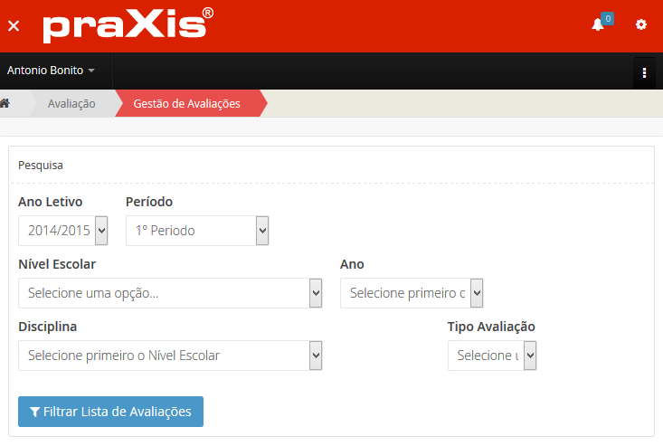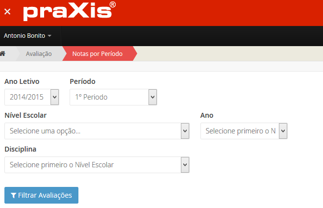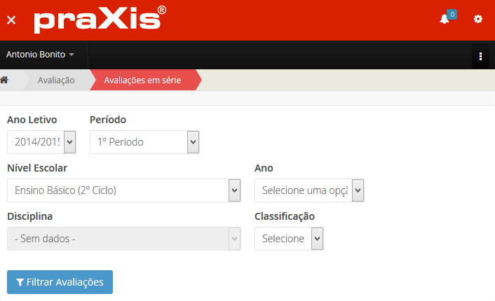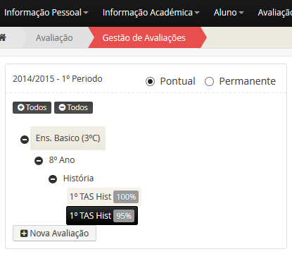 Nota: Para criar uma nova avaliação, terá de selecionar todas as opções de filtragem da página inicial (ver ponto anterior): Ano Letivo, Período, Nível Escolar, Ano e Disciplina.
