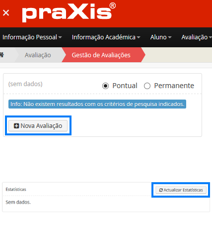 Caso não obtenha nenhuma informação na pesquisa efetuada, poderá optar por criar uma nova avaliação, clicando no botão “Nova Avaliação”.