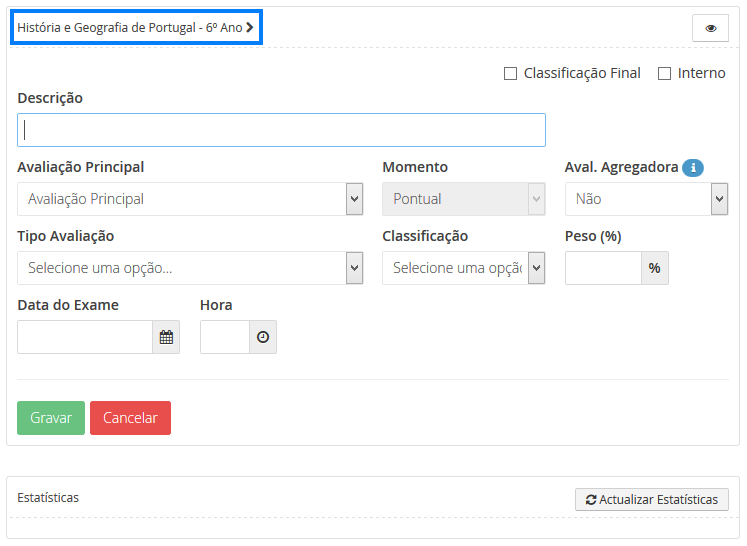 Clicando no botão “Nova Avaliação”, vai surgir uma nova secção onde deverá introduzir os dados da nova avaliação a criar.