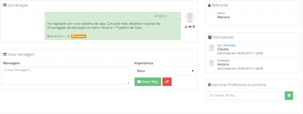 Esta área de gestão de detalhes está subdividida em cinco partes: Conversação, Referente, Participantes, Nova Mensagem e Adicionar Professores à Conversa