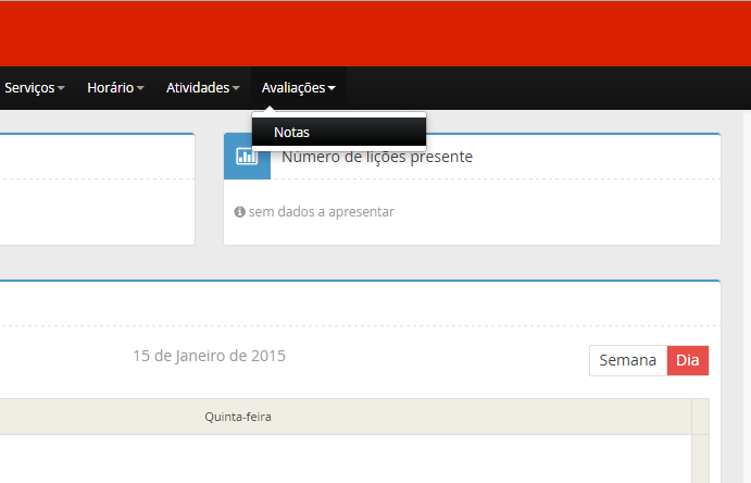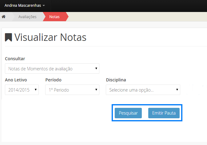 Caso não tenha nenhuma lista disponível de informações nesta secção, utilize os campos de filtragem: Momentos de Avaliação, Ano Letivo, Período e Disciplina. Se a pesquisa com filtros não devolver nenhum resultado, ou seja uma lista vazia, significa que ainda não foi atribuída nenhuma nota de avaliação ao seu educando.