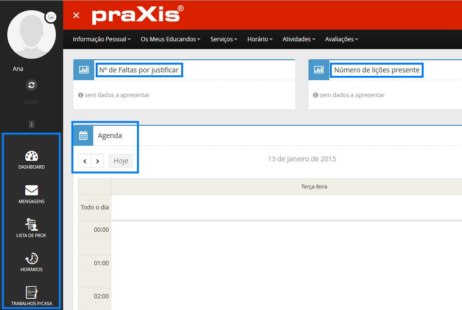 Ao aceder à Área de Gestão de Dados de Encarregado de Educação, poderá consultar várias informações relacionadas com os seus educandos, nomeadamente: o calendário escolar, os trabalhos de casa, atividades curriculares e extra curriculares, mensagens enviadas pelos docentes, serviços requisitados, lista de docentes do educando, etc...