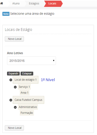 Para criar um novo Local de Estágio, clique no botão “Novo Local” deverá seguir sempre esta estrutura de hierarquia: Local de Estágio, Serviço e Área.