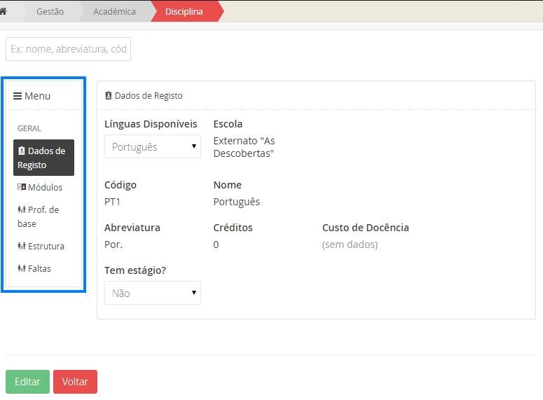 Após clicar no botão de detalhes , ser-lhe à apresentado os detalhes de um plano curricular.