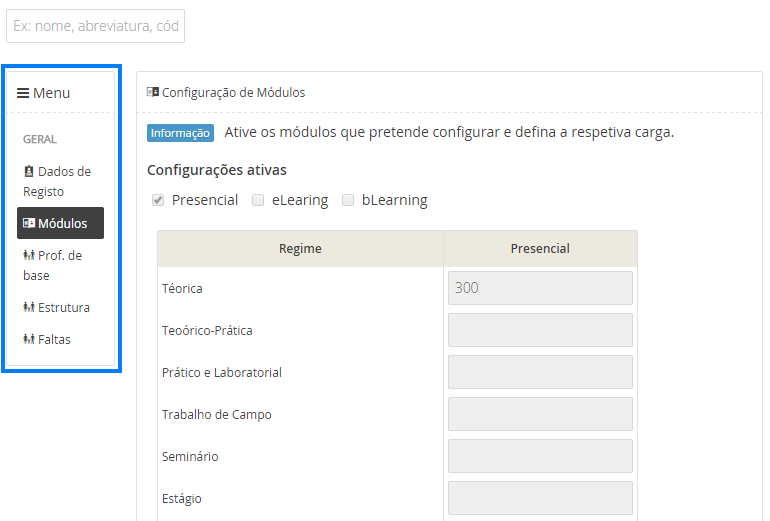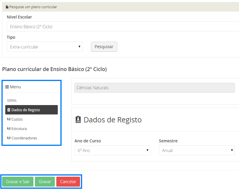 Nesta secção, pode selecionar os filtros consoante os parâmetros que pretende para o plano curricular. Clique no botão pesquisar para obter resultados.