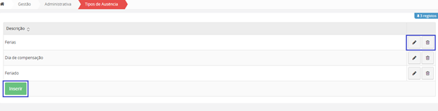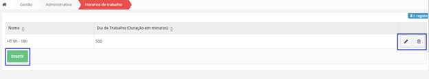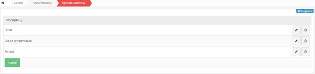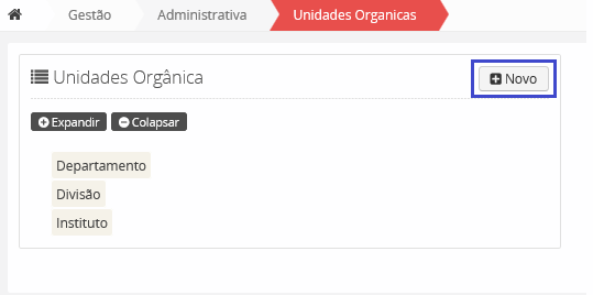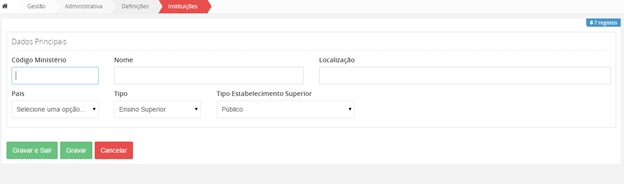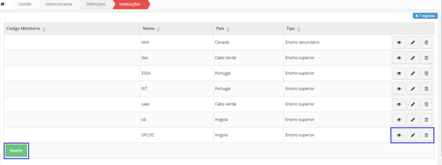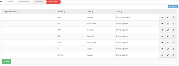 Para inserir uma nova Instituição, na interface inicial de Instituições, clique no botão no fim da página “Inserir”.