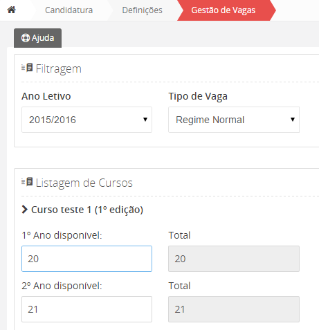 Aceda à página de gestão de vagas para verificar a configuração relativa ao número de vagas por curso e por ano de curso.