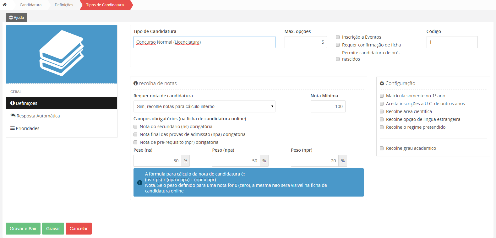 ver configuração de tipo de candidaturas