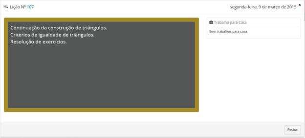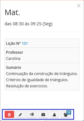 Ao aceder à Área de Gestão de Dados de uma entrada de Horário, poderá visualizar todos os detalhes e pormenores, clicando no quadrado com fundo verde em que lhe é apresentado uma janela (pop up) idêntica à primeira imagem em baixo (Fig.1). Na janela que aparece, poderá editar os dados, clicando no botão de edição . Nesta área de edição de dados de uma entrada no horário, poderá também consultar as seguintes secções: Sumário, Trabalhos para Casa (TPC), Alunos e Docentes. (Fig.2) Nota: Consoante as permissões da sua conta, poderá gerir os dados ou não. Se não tiver permissões para editar dados, a interface será apenas de apresentação de detalhes. Caso tenha permissões de edição de dados, a interface será a de edição de detalhes.
