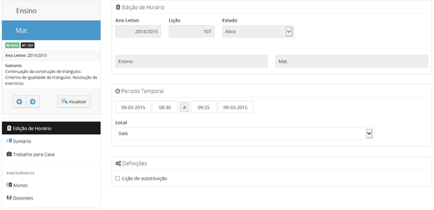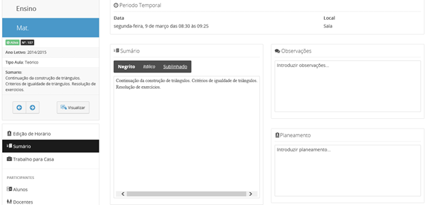 Para aceder à Área de Gestão de Sumário de uma entrada no horário, clique numa entrada do horário (fundo verde) para a qual quer alterar o sumário e clique no botão de sumário (terceiro botão na janela ilustrada na primeira imagem do ponto três). Note que pode também aceder a esta opção na área de edição, no menu lateral. Nesta área de edição, poderá alterar o sumário de uma aula ou atividade apresentada no horário. Verifique se tem permissões de edição de dados neste interface.