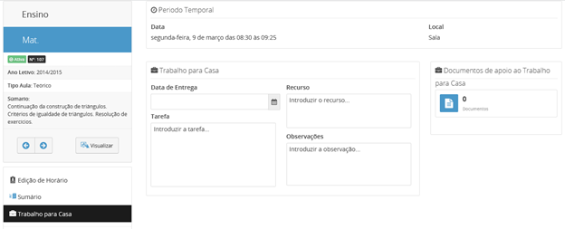 Para aceder à Área de Gestão de TPC's para aula, clique numa entrada do horário (fundo verde) para a qual quer alterar o TPC e clique no botão de TPC (quarto botão na janela ilustrada na primeira imagem do ponto três). Note que pode também aceder a esta opção na área de edição, no menu lateral. Nesta área de edição, poderá alterar o TPC de uma aula ou atividade apresentada no horário. Verifique se tem permissões de edição de dados neste interface.