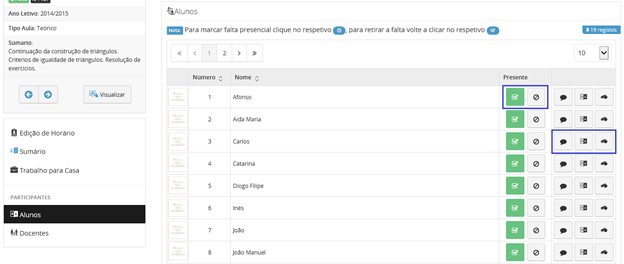 Para aceder à Área de Gestão de dados de assistência dos alunos, clique numa entrada do horário (fundo verde) para a qual quer consultar os alunos e clique no botão de alunos (sexto botão na janela ilustrada na primeira imagem do ponto três). Note que pode também aceder a esta opção na área de edição, no menu lateral. Nesta área de gestão, poderá consultar os alunos que devem assistir as aulas e fazer a gestão de presenças e faltas. Tem a possibilidade de Marcar ou Retirar a falta ao Aluno, inserindo uma observação, visualizando os detalhes do Aluno ou mesmo Relevar a falta. Verifique se tem permissões de edição de dados neste interface.