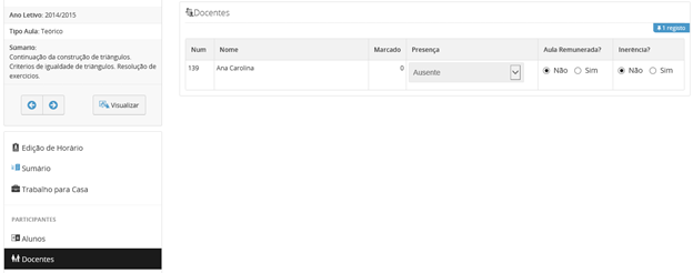 Para aceder à Área de Gestão de Consulta de Docentes Presentes na Aula, clique numa entrada do horário (fundo verde) para a qual quer consultar os docentes e clique no botão de docentes (quinto botão na janela ilustrada na primeira imagem do ponto três). Note que pode também aceder a esta opção na área de edição, no menu lateral. Nesta área de gestão, poderá consultar os Docentes que devem assistir às aulas.