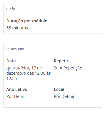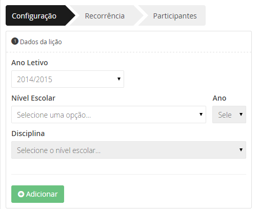 Nesta área de introdução de um novo horário, terá de preencher os dados que estão organizados em três secções: Configuração, Recorrência e Participantes.