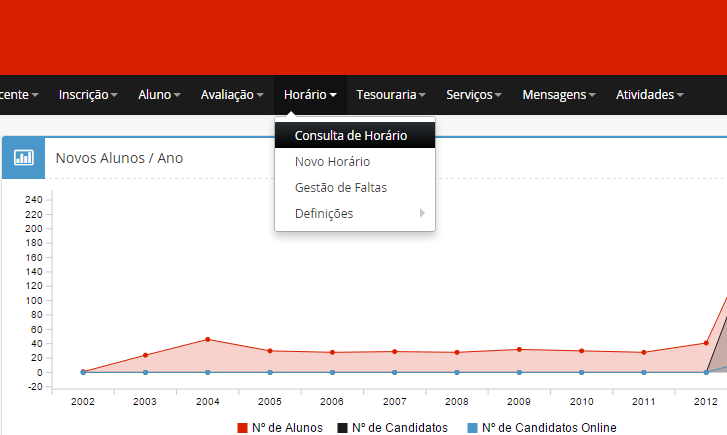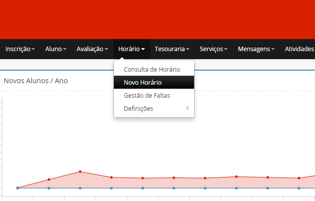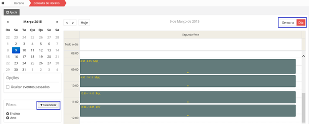 Ao aceder à secção de consulta de horário, ser-lhe-á apresentado uma janela (pop up) para efetuar uma pré-validação dos dados. Tem duas opções (Ensino e Ano) para introduzir a informação consoante a sua escolha. Nesta secção, poderá consultar o horário diário, semanal ou mensal. Poderá ainda consultar o seu horário para qualquer data, utilizando o calendário disponibilizado para tal. Para voltar ao ecrã de pré-seleção e filtragem dos parâmetros, clique no botão (Selecionar).