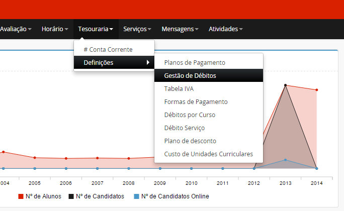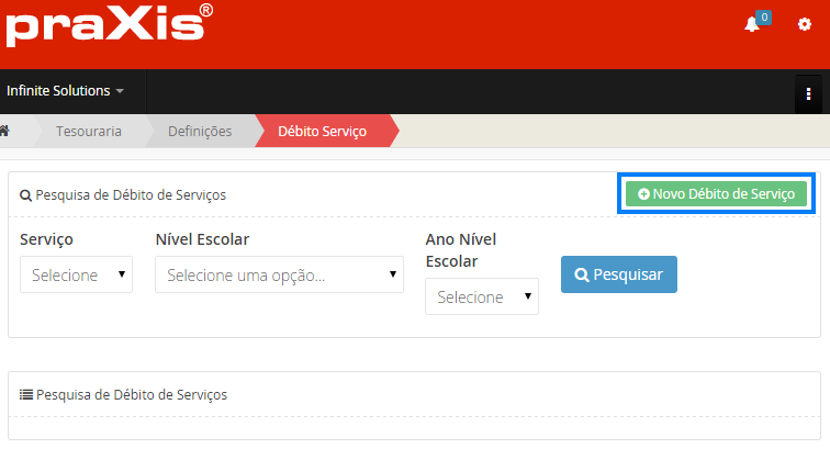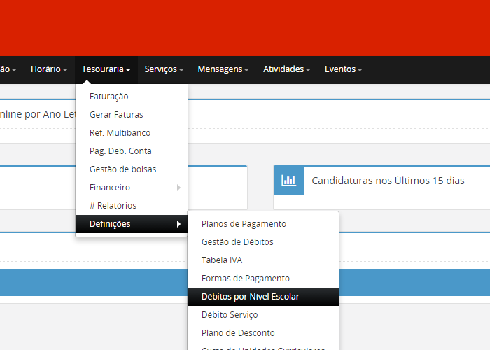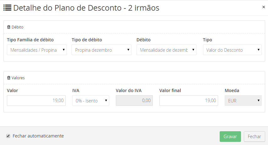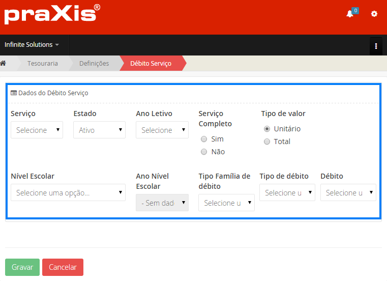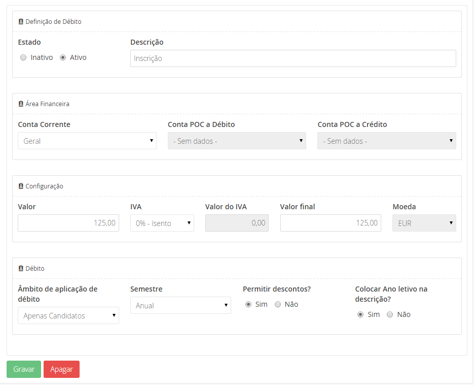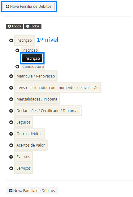 Para criar um novo débito, deverá seguir sempre esta estrutura de hierarquia: Família de Débito, Tipo de Débito e Débito.