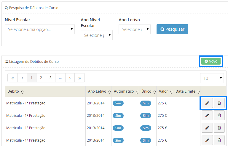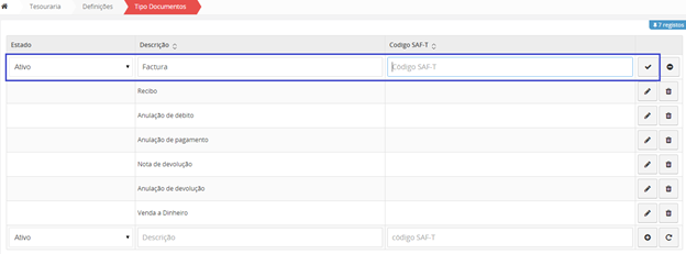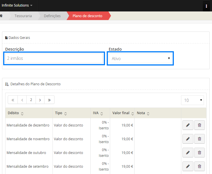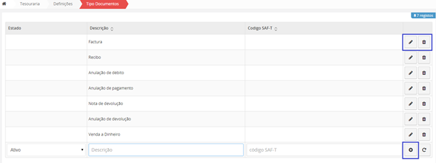Para eliminar um tipo de família de débito, um tipo de débito ou um débito, clique no botão apagar (vermelho).